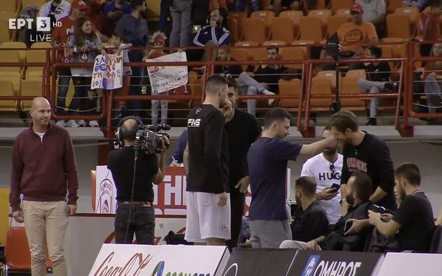 Μια εξαιρετική στιγμή σημειώθηκε στο ημίχρονο της αναμέτρησης του Ολυμπιακού με το Περιστέρι, με τον Κώστα Παπανικολάου, αρχικά να χαιρετά την οικογένεια του Βασίλη Σπανούλη και στην συνέχεια να έχει θερμό εναγκαλισμό με τον Γιώργο Πρίντεζη.