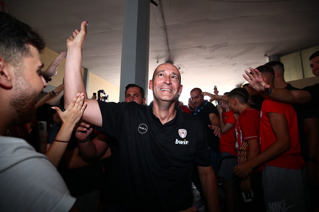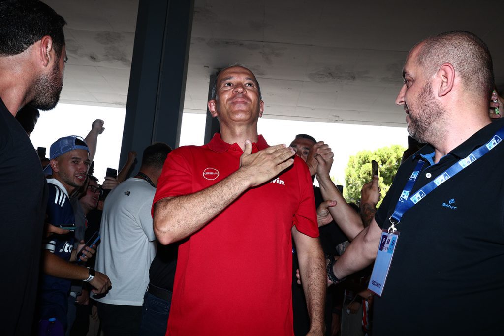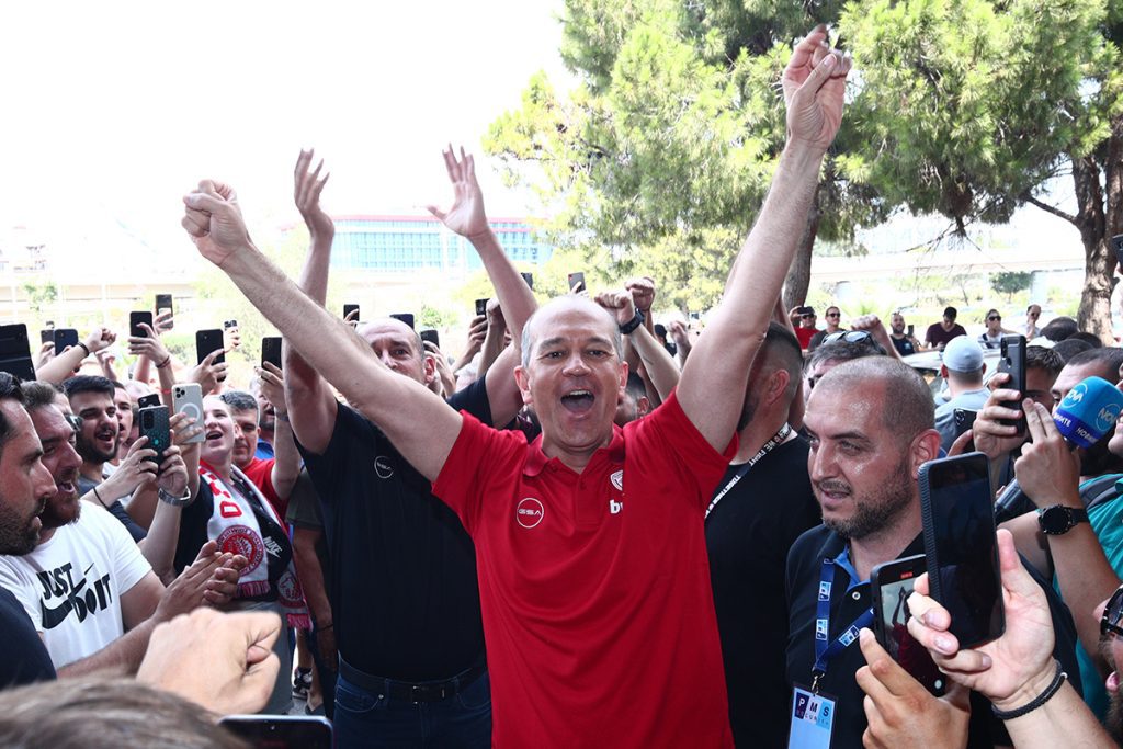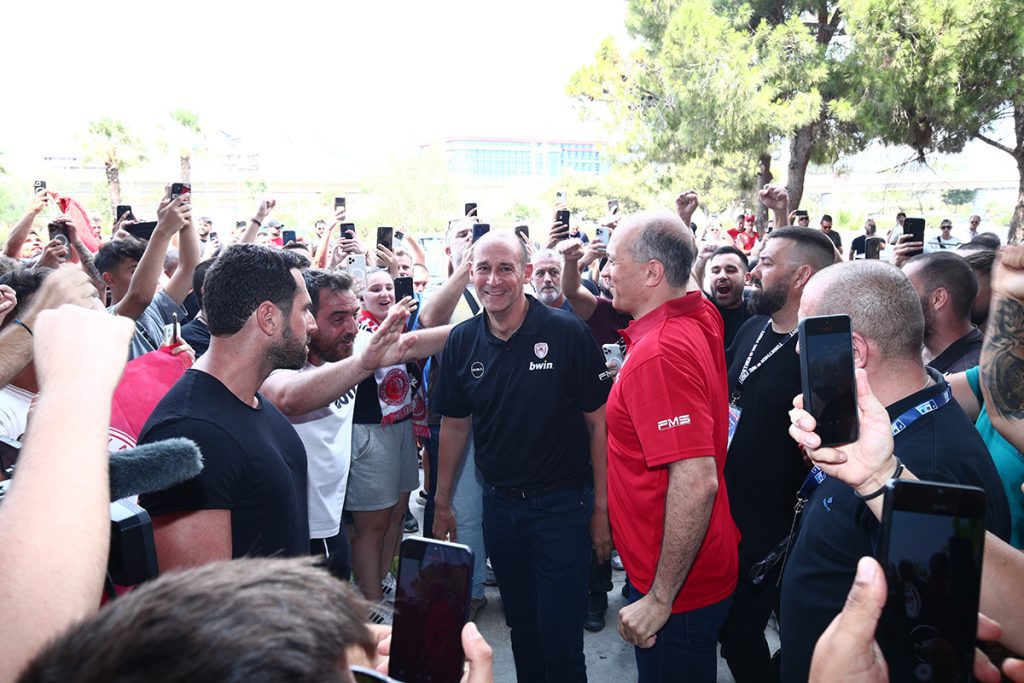 Αποθεωτικής υποδοχής από τον κόσμο του Ολυμπιακού έτυχαν οι πρόεδροι της ΚΑΕ, Γιώργος και Παναγιώτης Αγγελόπουλος, κατά την άφιξή τους στο ΣΕΦ για την παρουσίαση του Σάσα Βεζένκοφ.