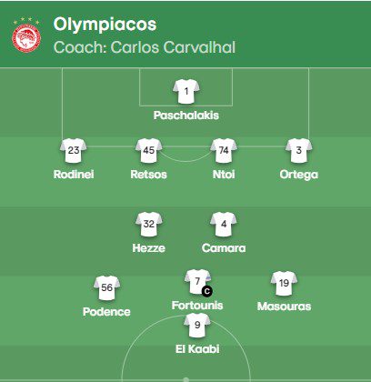 Ο Πασχαλάκης θα είναι κάτω από τα δοκάρια, με Ρέτσο και Ντόι στο κέντρο της άμυνας, με Ροντινέι και Ορτέγκα στα αμυντικά άκρα. Στο κέντρο ο Έσε με τον Καμαρά και τους Φορτούνη-Ποντένσε, στην επίθεση ο Μασούρας με τον Ελ Κααμπί.