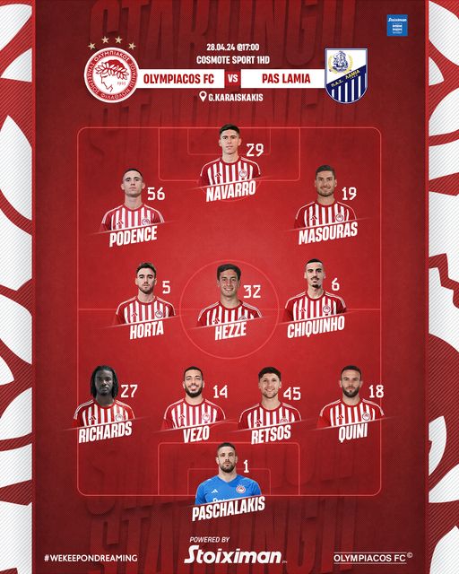 Ο Ολυμπιακός θα παραταχθεί στο σημερινό παιχνίδι με αντίπαλο την Λαμία (17:00) με την ακόλουθη 11άδα:
