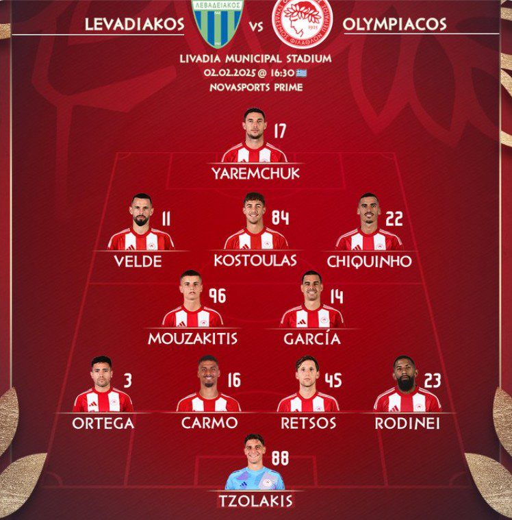 Ο Ολυμπιακός αντιμετωπίζει εκτός έδρας τον Λεβαδειακό (16:30, Novasports Prime και LIVE από το SPORT24) για την 21η αγωνιστική της Stoiximan Super League, με τον Χοσέ Λουίς Μεντιλίμπαρ να κάνει γνωστή την ενδεκάδα των ερυθρολεύκων.