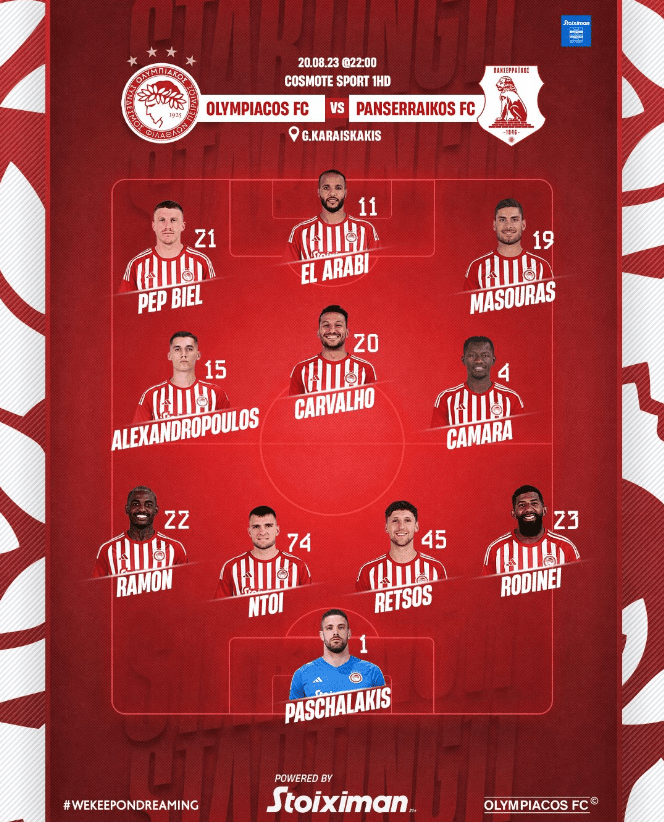 Ο Ολυμπιακός, στο αποψινό παιχνίδι στις 10 κόντρα στον Πανσερραϊκό, για την πρεμιέρα της Superleague, θα αγωνιστεί με την ακόλουθη 11άδα: