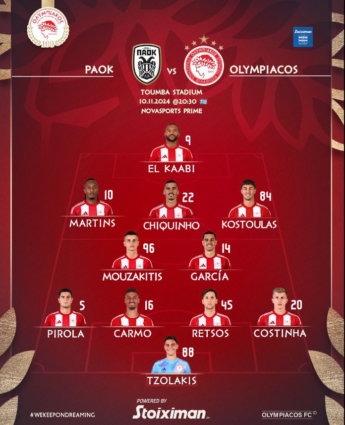 Ο Ολυμπιακός θα παραταχθεί κόντρα στον ΠΑΟΚ (20:30) με την ακόλουθη 11άδα:
