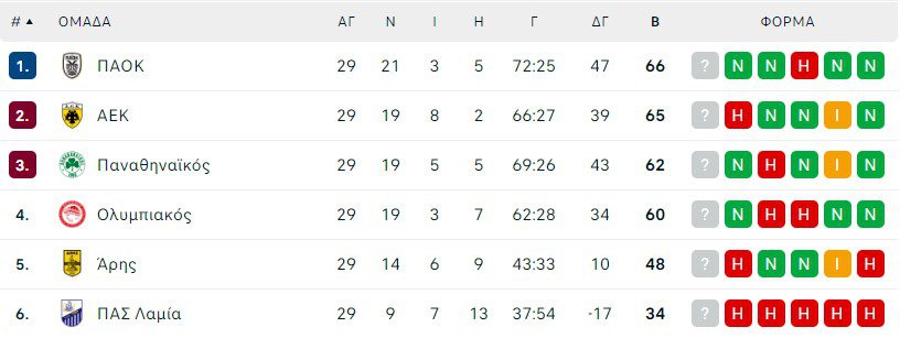 Ανακατατάξεις στην κορυφή της βαθμολογίας της Superleague αφού μετά από την ήττα της ΑΕΚ με 2-1 από τον Παναθηναϊκό, ο ΠΑΟΚ βρίσκεται στην πρώτη θέση με τον Ολυμπιακό να είναι πλέον στο -6 από την κορυφή.