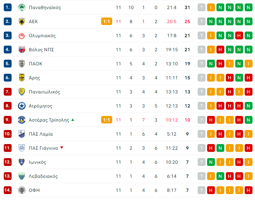 Η βαθμολογία μετά από 11 αγώνες είναι η ακόλουθη: