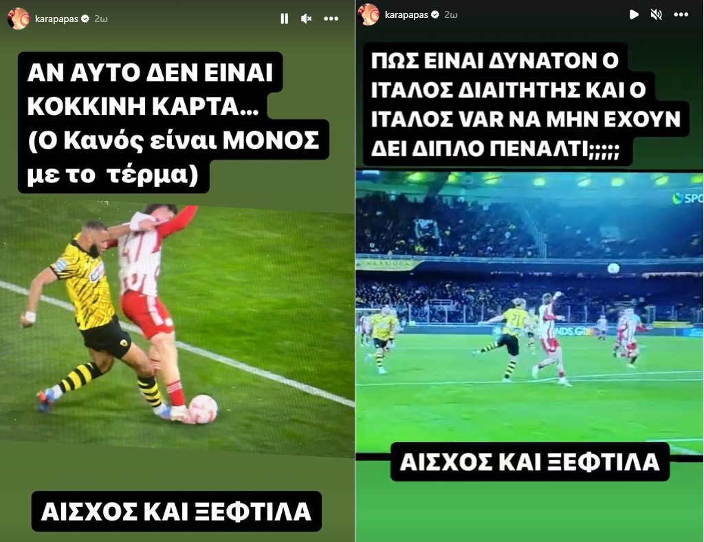 «Αν αυτό δεν είναι κόκκινη κάρτα… Ο Κανός είναι μόνος με το τέρμα», ενώ το δεύτερο τη φάση στο φινάλε του ημιχρόνου αναφέροντας «… πώς είναι δυνατόν ο Ιταλός διαιτητής και ο Ιταλός VAR να μην έχουν δει διπλό πέναλτι;».