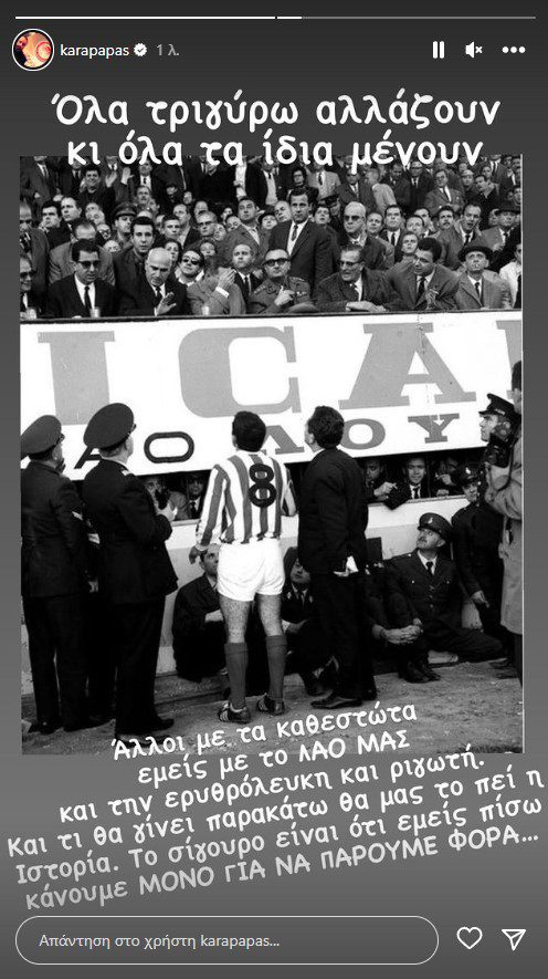 Ο Αντιπρόεδρος του Ολυμπιακού υπενθυμίζει τι έκανε ο Παναθηναϊκός στο περσινό ντέρμπι της Αγιά Σοφιάς κόντρα στην ΑΕΚ, ενώ σχολιάζει πως: «Όλα τριγύρω αλλάζουν και όλα τα ίδια μένουν. Αλλοι με τα καθεστώτα, εμείς με τον λαό μας και την ερυθρόλευκη και ριγωτή. Και τι θα γίνει παρακάτω θα μας το πει η Ιστορία. Το σίγουρο είναι ότι εμείς πίσω κάνουμε μόνο για να πάρουμε φόρα».