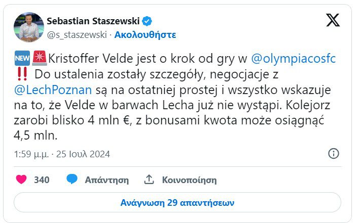 «Ο Κρίστοφερ Βέλντε είναι ένα βήμα από το παίξει στον Ολυμπιακό. Οι λεπτομέρειες έχουν συμφωνηθεί, οι διαπραγματεύσεις είναι στο τελικό στάδιο και όλα δείχνουν ότι ο Βέλντε δεν θα ξαναπαίξει για την Λεχ Πόζναν, η οποία θα κερδίσει περίπου τέσσερα εκατομμύρια ευρώ ενώ με τα μπόνους να ανέρχεται το ποσό στα 4,5 εκατομμύρια», αναφέρει το σχετικό δημοσιεύμα.