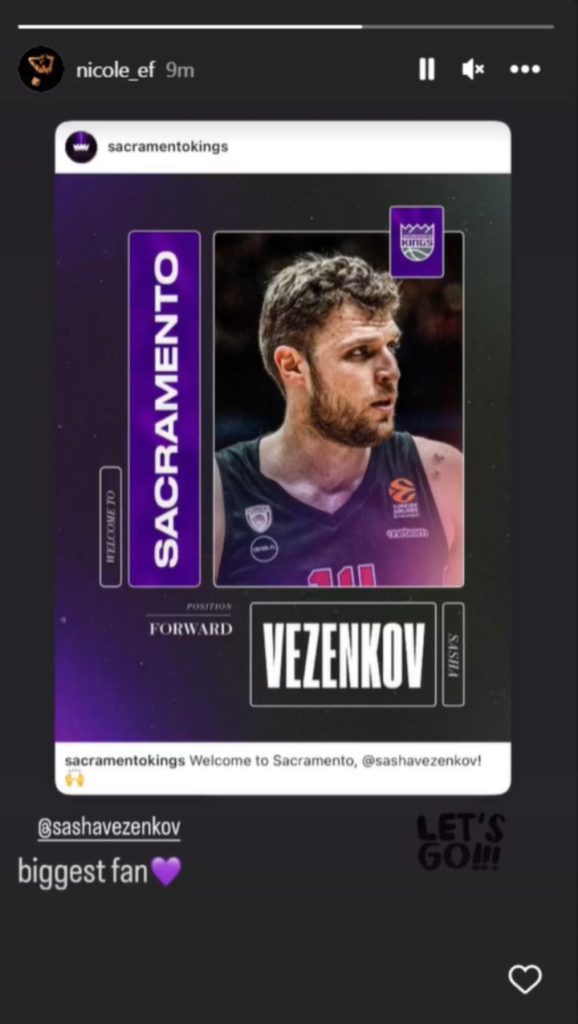 Οι Σακραμέντο Κινγκς ανακοίνωσαν και επίσημα την απόκτηση του Σάσα Βεζένκοβ, με την Νικόλ Ελευθεριάδου, με ένα γλυκό μήνυμα, να στηρίζει τον σύντροφο της, σε αυτό το νέο του ξεκίνημα.