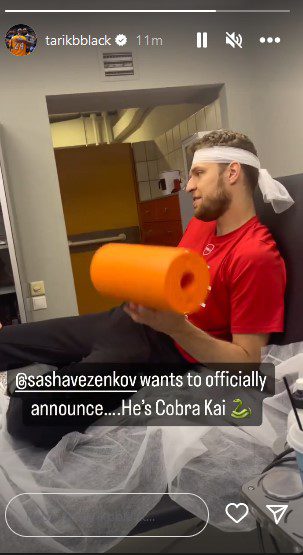Χαρακτηριστική η ανάρτηση του Ταρίκ Μπλακ στο Instagram, με τον Αμερικανό να δείχνει τον Σάσα Βεζένκοβ στα αποδυτήρια, τονίζοντας πως ο «ερυθρόλευκος» φόργουορντ έγινε και επίσημα μέλος του… Cobra Kai (!), λόγω της κορδέλας που έδεσε στο κεφάλι του ο άσος του Ολυμπιακού.