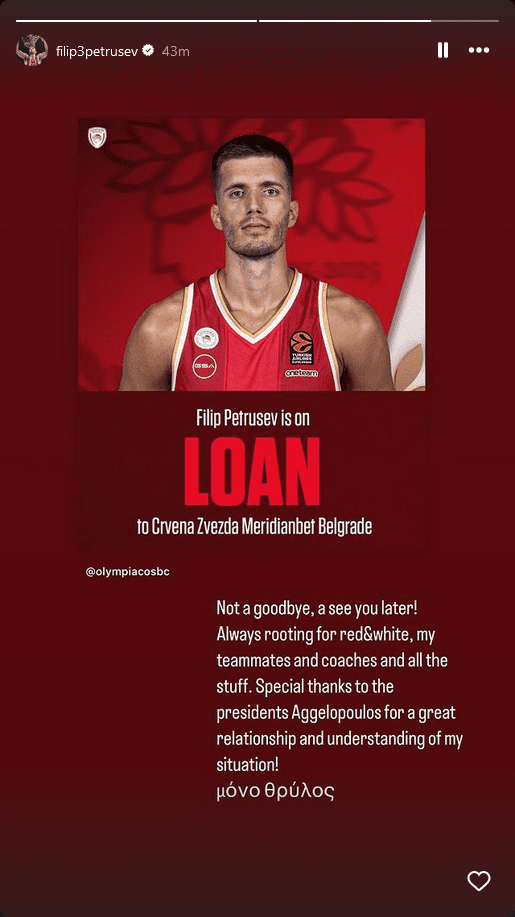 Ο Φιλίπ Πετρούσεβ με ένα story στον προσωπικό λογαριασμό του στο instagram θέλησε να στείλει ένα μήνυμα σχετικά με την παραχώρησή του ως δανεικός από τον Ολυμπιακό στον Ερυθρό Αστέρα, ευχαριστώντας όλους όσους συνεργάστηκε μαζί στους Πειραιώτες, τους αδερφούς Αγγελόπουλους που κατανόησαν την επιθυμία του για μεγαλύτερο ρόλο στην ομάδα και περισσότερα λεπτά στο παρκέ.