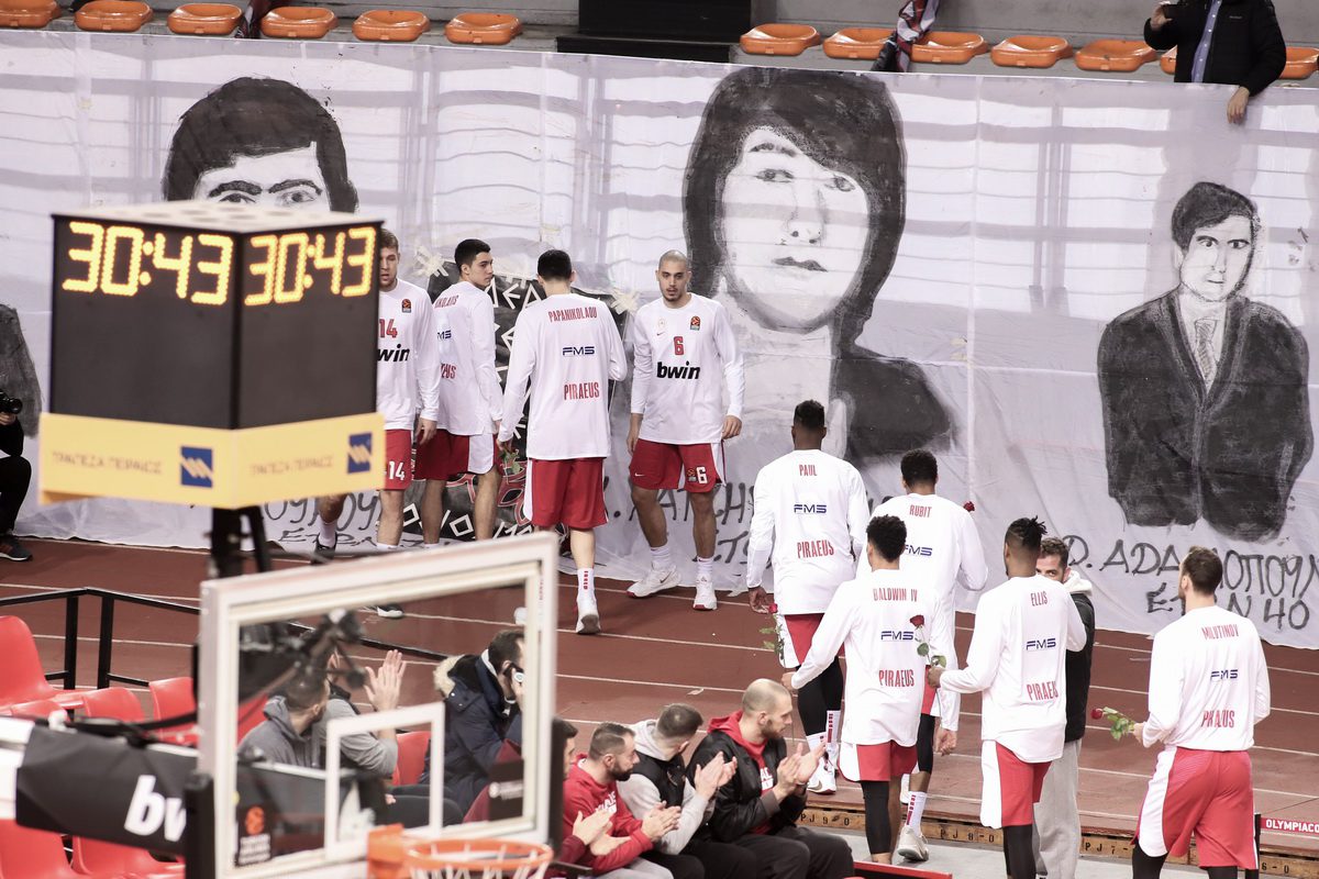 Έτσι, σύσσωμη η ομάδα του Ολυμπιακού, με την είσοδο της στο παρκέ για την καθιερωμένη προθέρμανση, κατευθύνθηκε στο πέταλο των οργανωμένων οπαδών και άφησε λουλούδια στο πανό που απεικονίζει τα 21 αδέλφια μας.