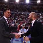 Μια εξαιρετική στιγμή σημειώθηκε στο ημίχρονο της αναμέτρησης του Ολυμπιακού με το Περιστέρι, με τον Κώστα Παπανικολάου, αρχικά να χαιρετά την οικογένεια του Βασίλη Σπανούλη και στην συνέχεια να έχει θερμό εναγκαλισμό με τον Γιώργο Πρίντεζη.