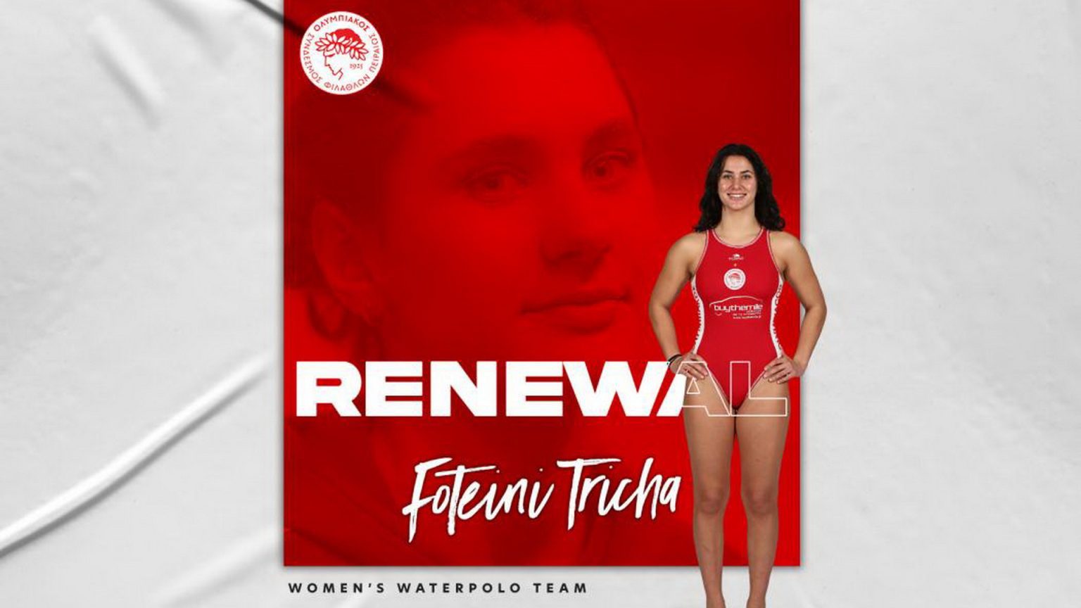 Ο ΟΛΥΜΠΙΑΚΟΣ Σ.Φ.Π. ανακοινώνει την ανανέωση της συνεργασίας του με την Φωτεινή Τριχά. Η διεθνής περιφερειακή υπέγραψε το νέο της συμβόλαιο και παραμένει στο ρόστερ της ομάδας πόλο Γυναικών του συλλόγου.