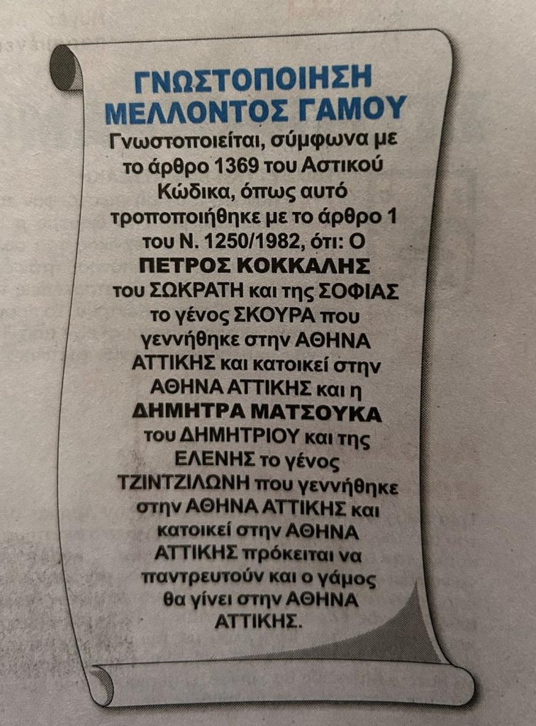 «Γνωστοποιείται σύμφωνα με το άρθρο 1369 του Αστικού Κώδικα, όπως αυτό τροποποιήθηκε με το άρθρο 1 του Ν. 1250/1982 ότι: Ο Πέτρος Κόκκαλης του Σωκράτη και της Σοφίας, το γένος Σκούρα που γεννήθηκε στην Αθήνα Αττικής και κατοικεί στην Αθήνα Αττικής και η Δήμητρα Ματσούκα του Δημητρίου και της Ελένης, το γένος Τζιντζιλιώνη που γεννήθηκε στην Αθήνα Αττικής και κατοικεί στην Αθήνα Αττικής, πρόκειται να παντρευτούν και ο γάμος θα γίνει στην Αθήνα Αττικής».