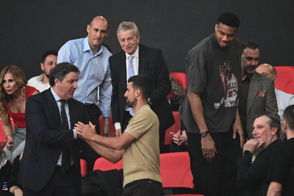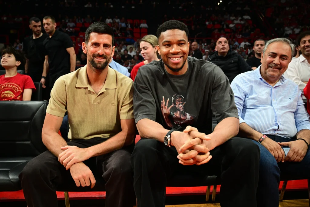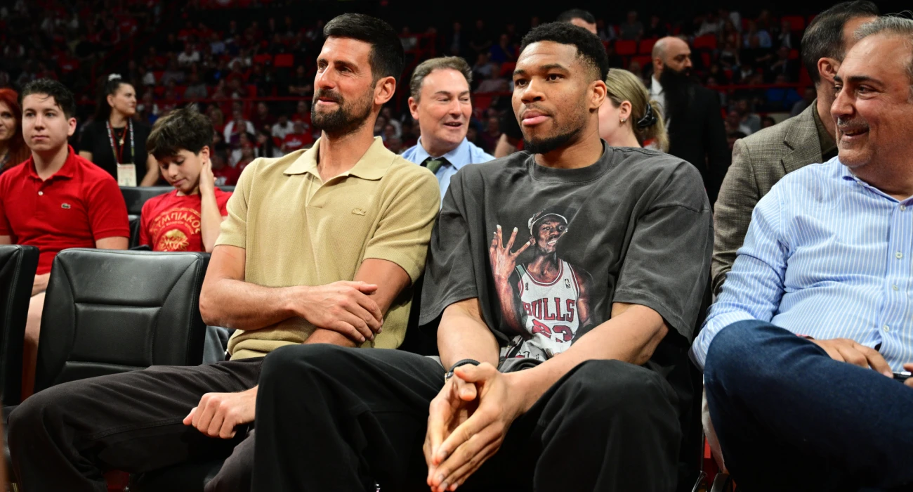 Φυσικά, δε βρέθηκε μόνος του εκεί, με τον «θαμώνα» του ΣΕΦ, τον Νόβακ Τζόκοβιτς να κάθεται δίπλα του και οι δυο άντρες να παρακολουθούν μαζί την αναμέτρηση! Ο Έλληνας σούπερ σταρ, φορούσε μια μπλούζα η οποία είχε επάνω τον Μάικλ Τζόρνταν, μετά την κατάκτηση ενός πρωταθλήματος με τους Σικάγο Μπουλς!