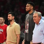 Ο «Greek Freak, αφού έκατσε στα… θεωρία του φαληρικού γηπέδου, εκεί όπου βρισκόταν ο Ντέγιαν Μποντιρόγκα, κατέβηκε στα court-seats και βρέθηκε δίπλα στο παρκέ.