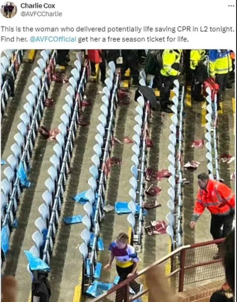 Ηρωίδα θεωρείται από τους οπαδούς της Άστον Βίλα η γυναίκα διασώστης που έσωσε οπαδό της ομάδας ο οποίος υπέστη καρδιακή ανακοπή στον θρίαμβο 4-2 του Ολυμπιακού στον πρώτο ημιτελικό του Conference League το βράδυ της Μεγάλης Πέμπτης.