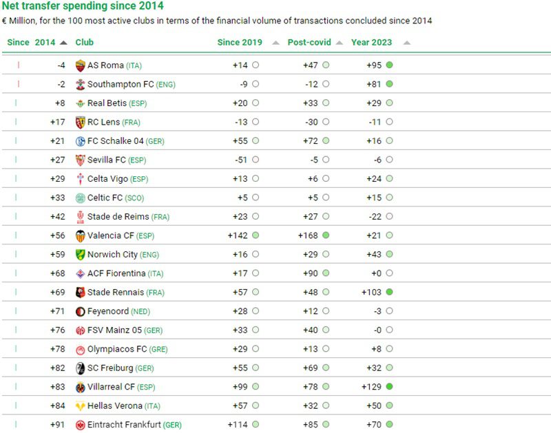 Αντίθετα, η Μπενφίκα ξεπερνά τον Άγιαξ (+434εκ.) και τη Σάλτσμπουργκ (+422εκ.) την τελευταία δεκαετία, ενώ η Βιγιαρεάλ έχει το πιο θετικό υπόλοιπο για το ημερολογιακό έτος 2023 (+117εκ.).