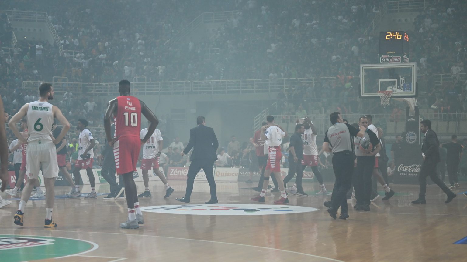 Η εξέλιξη του αγώνα και η διαφορά που ξεπέρασε ακόμα και τους 30 πόντους, εξόργισε την «πράσινη» εξέδρα, η οποία απάντησε με ρίψη καπνογόνων προς το προστατευτικό δίκτυ, τον πάγκο του Ολυμπιακού να αποχωρεί προς τα αποδυτήρια, με τους διαιτητές να διατάζουν την προσωρινή διακοπή του ματς, μέχρι να συμμορφωθεί η εξέδρα και να καθαρίσει η ατμόσφαιρα.