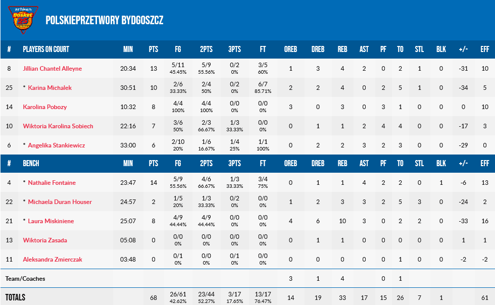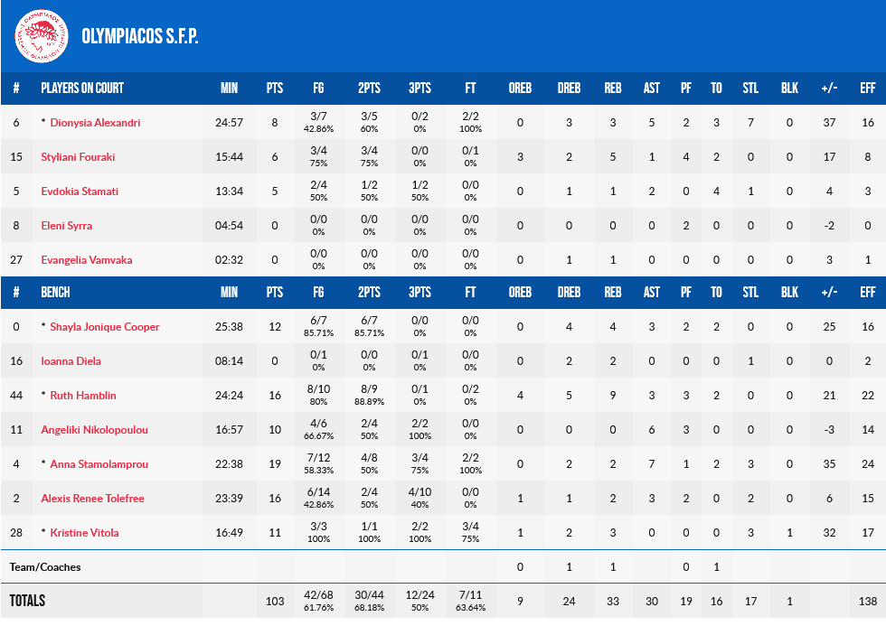 Με… φόρα από την περσινή σεζόν, ξεκίνησε και φέτος η Άννα Νίκη Σταμολάμπρου, που τελείωσε το παιχνίδι με 19 πόντους και επτά ασίστ. Από 16 πόντους είχαν οι Τόλφρι και Χάμπλιν, με την τελευταία να έχει και εννέα ριμπάουντ, ενώ 12 πόντους είχε η Κούπερ, 11 η Βίτολα και 10 η Νικολοπούλου. Ιδιαίτερη αναφορά θα πρέπει να γίνει και στην Αλεξανδρή, που τελείωσε το παιχνίδι με οκτώ πόντους, επτά κλεψίματα και πέντε ριμπάουντ.