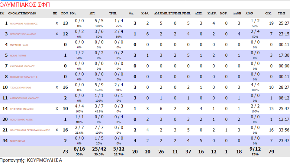 Μελισσαράτος και Τζόλος με 16 πόντους ήταν οι πρώτοι σκόρερ από πλευράς Ολυμπιακού Β’, με τον Αλέξανδρο Νικολαΐδη, μετά την εξαιρετική εμφάνιση με την Βιλερμπάν, να έχει 13 πόντους, πέντε ριμπάουντ, τέσσερα κλεψίματα και τρει ασίστ, τον Πετρόπουλο να προσθέτει 12 και τον Χρηστίδη 10 πόντους.
