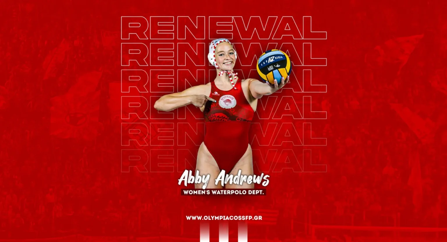 Ο ΟΛΥΜΠΙΑΚΟΣ Σ.Φ.Π. ανακοινώνει την ανανέωση της συνεργασίας του με την Άμπι Άντριους. Η διεθνής Αυστραλή περιφερειακή υπέγραψε το νέο της συμβόλαιο και παραμένει στο ρόστερ της ομάδας πόλο Γυναικών του συλλόγου.