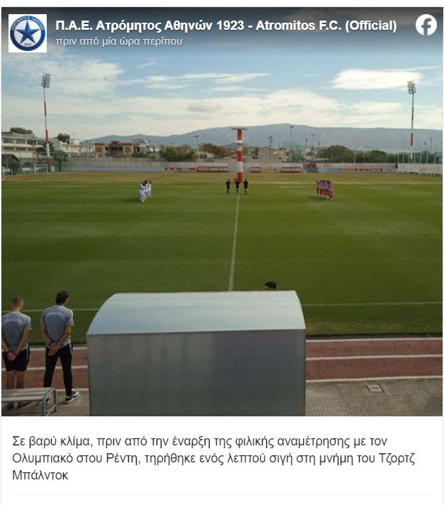 ΠΑΡΑΣΚΗΝΙΑ Ενος λεπτού σιγή για Μπάλντοκ στο φιλικό του Ολυμπιακού Last updated: 10/10/2024 1:39 ΜΜ REDNEWS Team Published: 10/10/2024 Κοινοποίηση Κοινοποίηση Ενός λεπτού σιγή στη μνήμη του Τζορτζ Μπάλντοκ τηρήθηκε στο φιλικό μεταξύ του Ολυμπιακού και του Ατρομήτου στο Ρέντη. Ολυμπιακός | Έδειξε δίψα για να κάνει ένα ακόμα ντάμπλ με 6 διαφορετικούς σκόρερ κόντρα στον Ηρακλή Τι κοιτάζει στην αγορά ο Ολυμπιακός και οι φήμες για Τζολάκη Δ. Βερβελές: «Θεωρώ ότι δε θα ξαναδούμε τον Καμπελά στον Ολυμπιακό – Αν δεν προκύψει κάτι μεγάλο, ο Ελ Κααμπί θα παραμείνει» Βαρύ πένθος για την οικογένεια: Εφυγε από τη ζωή η μητέρα του Βαγγέλη Μαρινάκη, Ειρήνη Χριστόγλου: «Ο Στρεφέτσα βάζει… σημάδι τους τερματοφύλακες – Δεν ήταν στα καλά του ο Ολυμπιακός» VIDEO Κοινοποίηση άρθρου Facebook Whatsapp Whatsapp Copy Link ByREDNEWS TeamΑκολουθήστε:Είσαι στο μυαλό κάτι μαγικό όπου πας εσύ πάντα θα μαι εγώ να σου τραγουδώ Θρύλε ολέ, ολέ, Θρύλε ολέ, ολέ... Επομενο θεμα Εκτός προπόνησης ο Πετρούσεβ Προηγουμενο θεμα Ράιτ: “Ανυπομονώ να επιστρέψει ο Φαλ” Rednews Youtube Ροή Ειδήσεων Ντόρσεϊ για τον πανηγυρισμό του: «Μαγειρεύω παϊδάκια με μπάρμπεκιου σος» OLYMPIACOS BC 20/12/2025 Φουρνιέ: «Κάποιες φορές μεγαλώνεις μέσα από τις δυσκολίες» OLYMPIACOS BC 20/12/2025 Παπανικολάου: «Ο εγωισμός μας θίχτηκε μετά το τελευταίο ματς» OLYMPIACOS BC 20/12/2025 Μπαρτζώκας: «Σημαίνει πολλά που άκουσα το όνομά μου από τους φίλους του Ολυμπιακού, την Κυριακή ο Μόρις θα παίξει απέναντι στον Κολοσσό» OLYMPIACOS BC 19/12/2025 Ξεμπούκωσε OLYMPIACOS BC 19/12/2025 Σε… χριστουγεννιάτικη διάθεση το ΣΕΦ στο ματς με την Βιλερμπάν OLYMPIACOS BC 19/12/2025