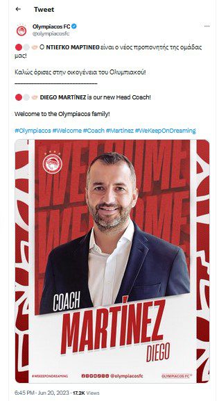 Την ανάληψη της τεχνικής ηγεσίας του Ολυμπιακού από τον Ντιέγκο Μαρτίνεθ ανακοίνωσαν οι “ερυθρόλευκοι”, με τον 42χρονο Ισπανό πρώην προπονητή της Εσπανιόλ, να αποτελεί τον εκλεκτό του Κορδόν για την θέση.