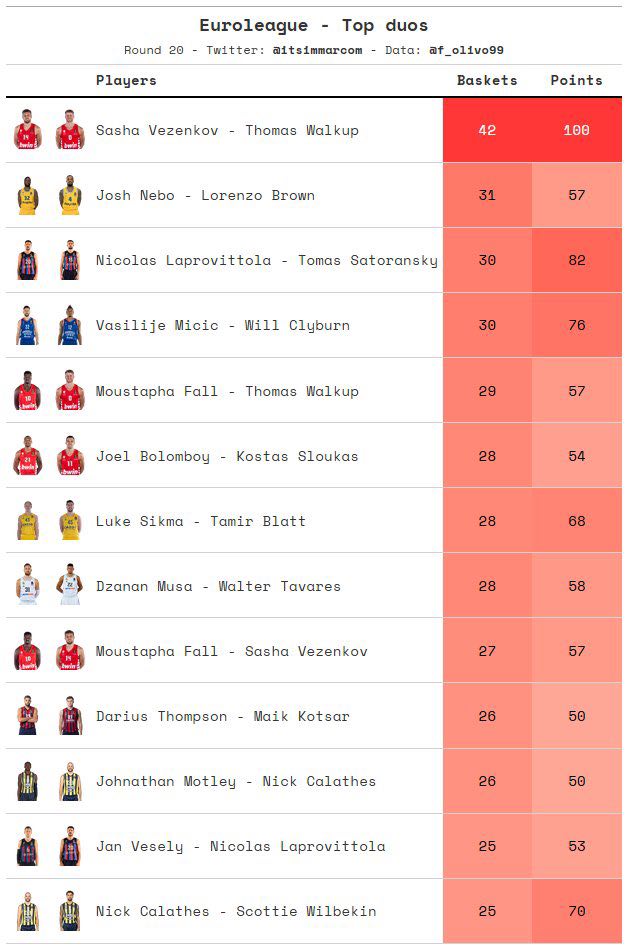 Αυτό που κάνει τον Ολυμπιακό, όμως, να ξεχωρίζει, δεν είναι μόνο η πρωτιά των Γουόκαπ – Βεζένκοβ, αλλά το ότι στην πρώτη 10αδα των πιο παραγωγικών επιθετικών διδύμων της Euroleague, βρίσκουμε ακόμα τρία «ερυθρόλευκα» ζευγάρια.