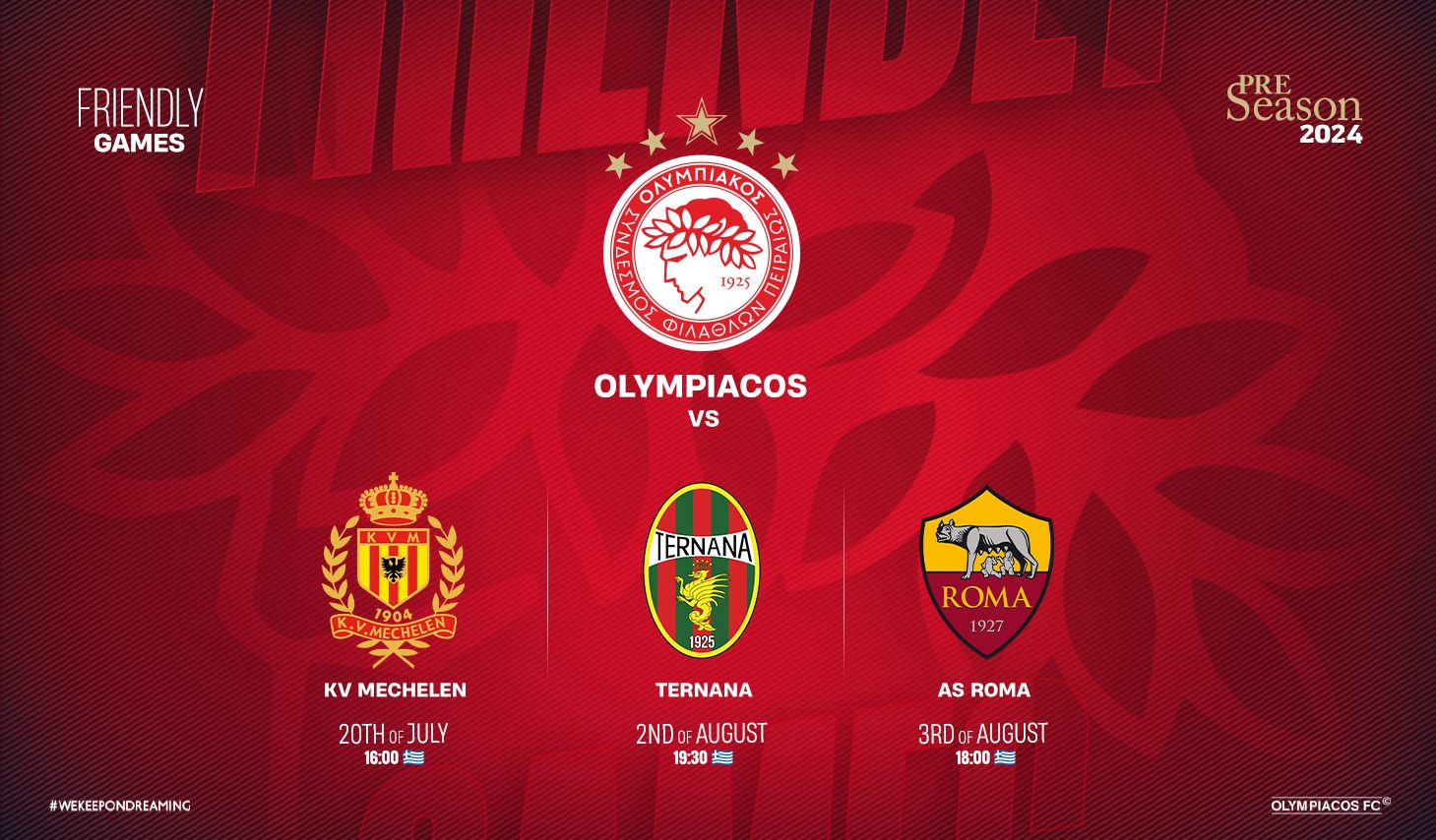 Τρία ακόμη φιλικά ανακοινώνει η ΠΑΕ Ολυμπιακός, στο πλαίσιο της καλοκαιρινής προετοιμασίας για την αγωνιστική περίοδο 2024-25.