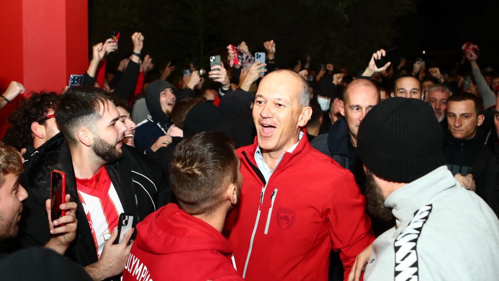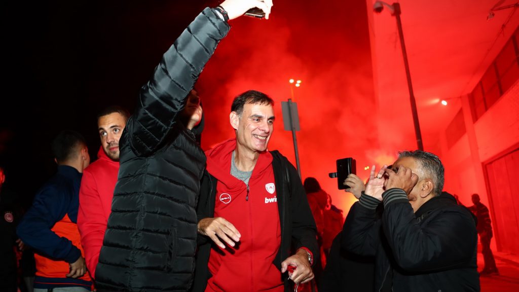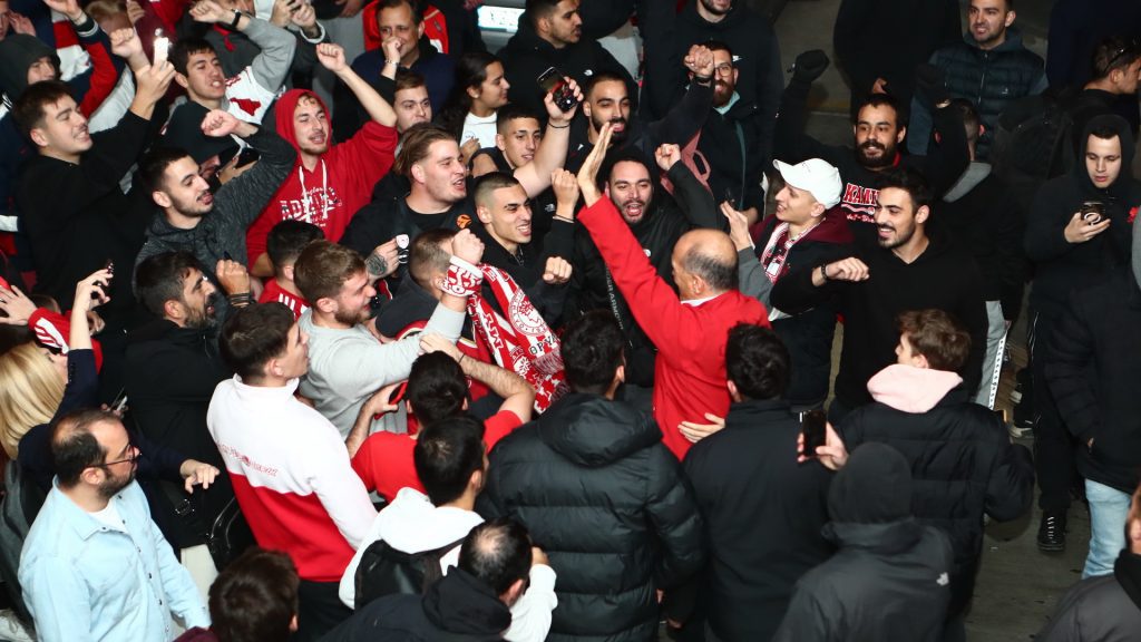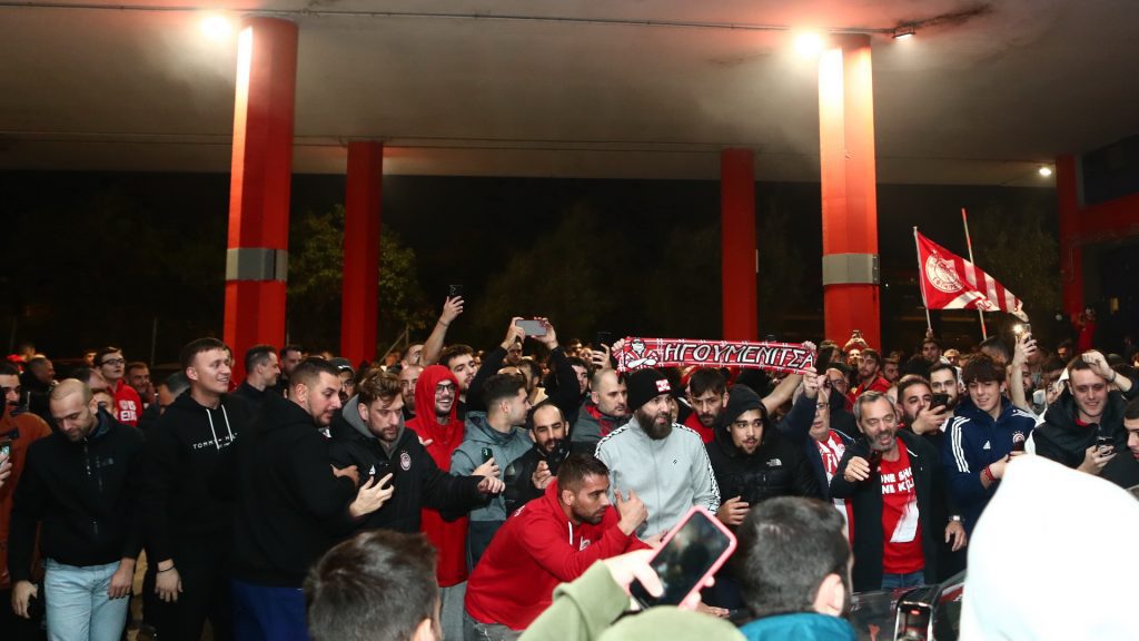 Πάνω από 1000 φίλοι των «ερυθρόλευκων» μαζεύτηκαν στο ΣΕΦ για να υποδεχθούν το πούλμαν που μετέφερε την «ερυθρόλευκη» αποστολή πίσω στην βάση της.