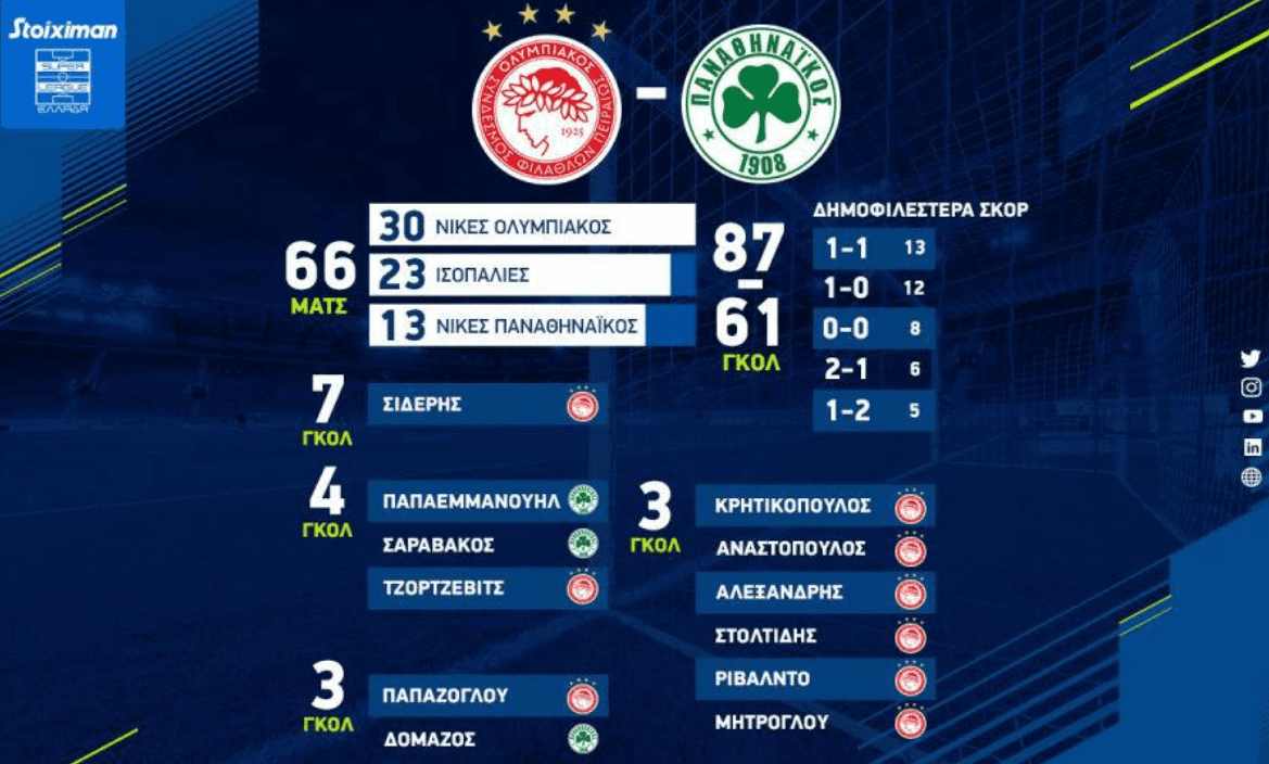 Ο Ολυμπιακός έχει υποδεχθεί τον Παναθηναϊκό 66 φορές για την Α’ Εθνική/Stoiximan Super League και έχει επικρατήσει τις 30, ενώ ο Παναθηναϊκος έχει 13 νίκες. Οι δύο ομάδες έχουν φύγει από το γήπεδο ισόπαλες 23 φορές.