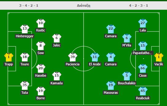 Κάτω από τα δοκάρια θα βρεθεί ο Βατσλίκ, στα άκρα της άμυνας οι Λαλά και Ρέαμπτσιουκ και στο κέντρο αυτής οι Παπασταθόπουλος και Σισέ. Εμβιλά, Μπουχαλάκης και Μαντί Καμαρά θα βρεθούν στο κέντρο, Αγκιμπού Καμαρά και Μασούρας στις πτέρυγες και μοναδικός προωθημένος ο Ελ Αραμπί.