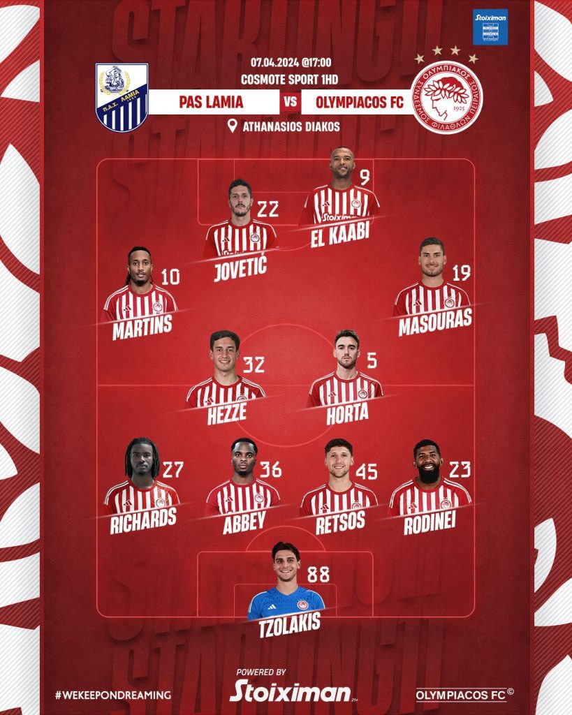 Ο Τζολάκης βρίσκεται κάτω από τα δοκάρια, με τους Ρέτσο – Άμπι μπροστά του και τους Ροντινέι – Ρίτσαρντς στα αμυντικά άκρα. Οι Όρτα και Έσε αποτελούν το δίδυμο του άξονα, με τους Μασούρα – Μαρτίνς στα άκρα και τον Γιόβετιτς πίσω από τον Ελ Κααμπί.