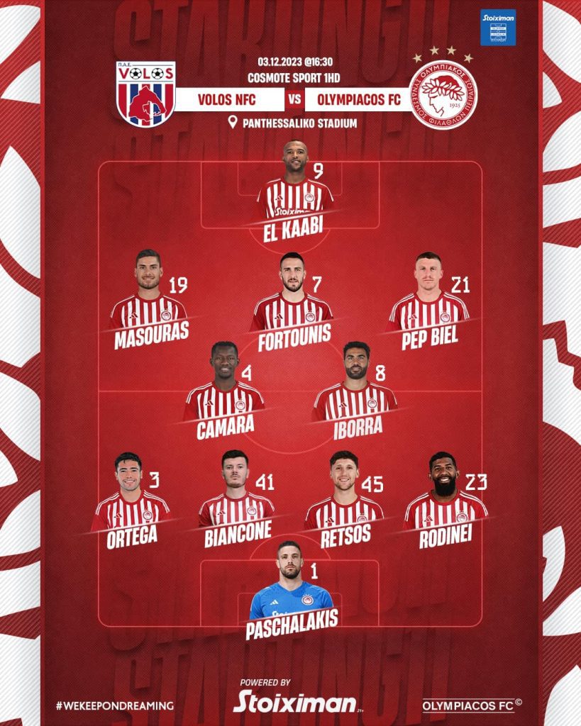 Αναλυτικά η ενδεκάδα του Ολυμπιακού: Πασχαλάκης, Ροντινέι, Ρέτσος, Μπιανκόν, Ορτέγκα, Καμαρά, Ιμπόρα, Μπιέλ, Μασούρας, Φορτούνης, Ελ Κααμπί.