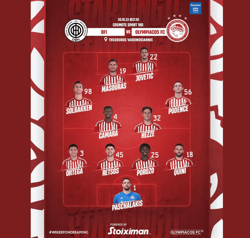 Ο Ολυμπιακός θα παραταχθεί στην σημερινή αναμέτρηση με αντίπαλο τον ΟΦΗ (21.30) με την ακόλουθη 11άδα: