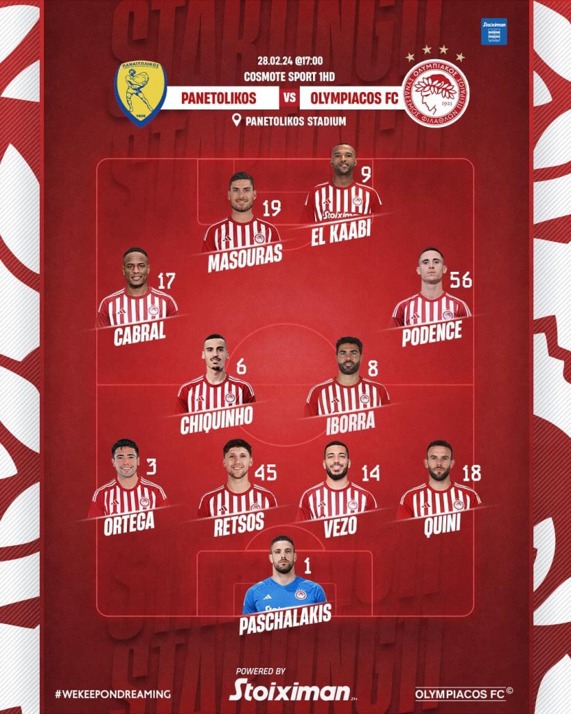 Ο Πασχαλάκης θα είναι κάτω από τα δοκάρια, με Βέζο και Ρέτσο στο κέντρο της άμυνας, Κίνι και Ορτέγκα στα αμυντικά άκρα. Στο κέντρο ο Ιμπόρα με τον Τσικίνιο, στα εξτρέμ ο Καμπράλ με τον Ποντένσε και στην επίθεση ο Μασούρας με τον Ελ Κααμπί.