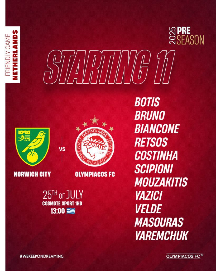 Ο Ολυμπιακός θα παραταχθεί στο σημερινό (13:00) φιλικό με την Νόριτς, με την ακόλουθη 11άδα: