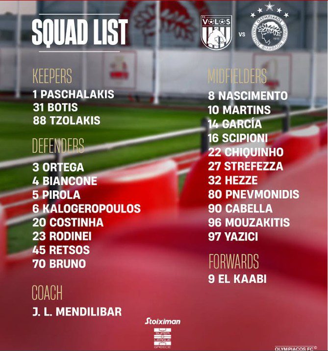 Οι νταμπλούχοι Ελλάδας την Παρασκευή (29/08) ολοκλήρωσαν την προετοιμασία τους για το εκτός έδρας ματς, με μία προπόνηση που πραγματοποιήθηκε στο αθλητικό κέντρο στο Ρέντη. Μετά το τέλος της προπόνησης ο τεχνικός της ομάδας, Χοσέ Λουίς Μεντιλίμπαρ, ανακοίνωσε την αποστολή για τον αγώνα στον Βόλο, την οποία απαρτίζουν οι: