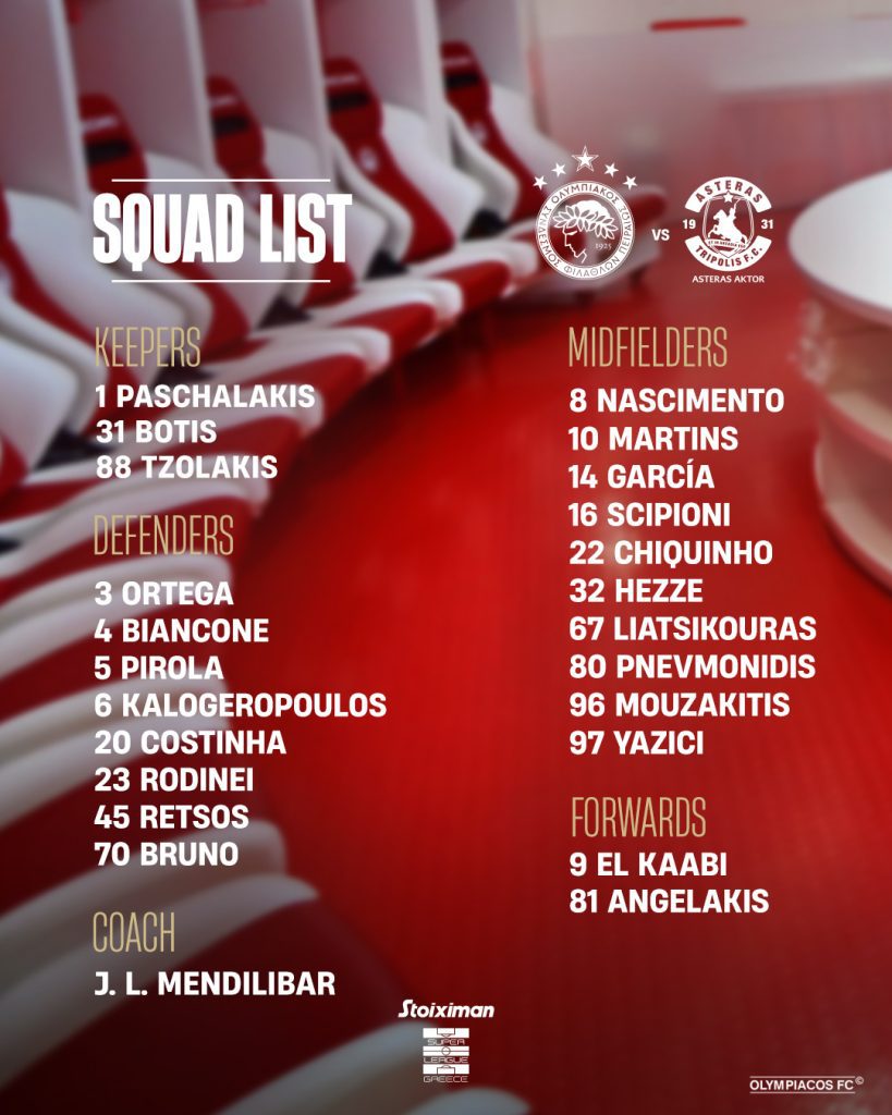 Ο Χοσέ Λουίς Μεντιλίμπαρ ανακοίνωσε την αποστολή του Ολυμπιακού για τον αγώνα της πρεμιέρας του πρωταθλήματος το Σάββατο (20:00) με αντίπαλο τον Asteras Aktor.