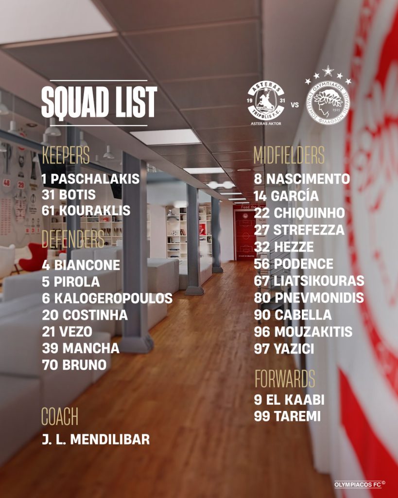 Αναλυτικά η αποστολή του Ολυμπιακού: Πασχαλάκης, Μπότης, Κουράκλης, Μπιανκόν, Πιρόλα, Καλογερόπουλος, Κοστίνια, Βέζο, Μάνσα, Μπρούνο, Νασιμέντο, Γκαρθία, Τσικίνιο, Στρεφέτσα, Έσε, Ποντένσε, Λιατσικούρας, Πνευμονίδης, Καμπελά, Μουζακίτης, Γιαζίτζι, Ελ Κααμπί, Ταρέμι.