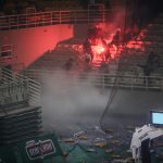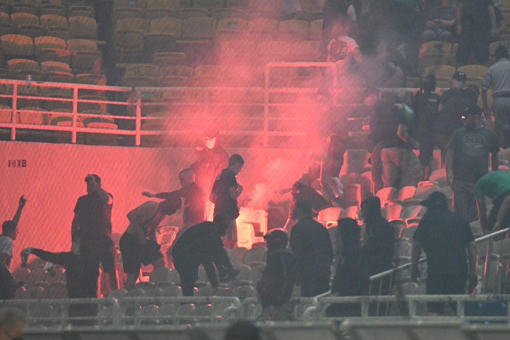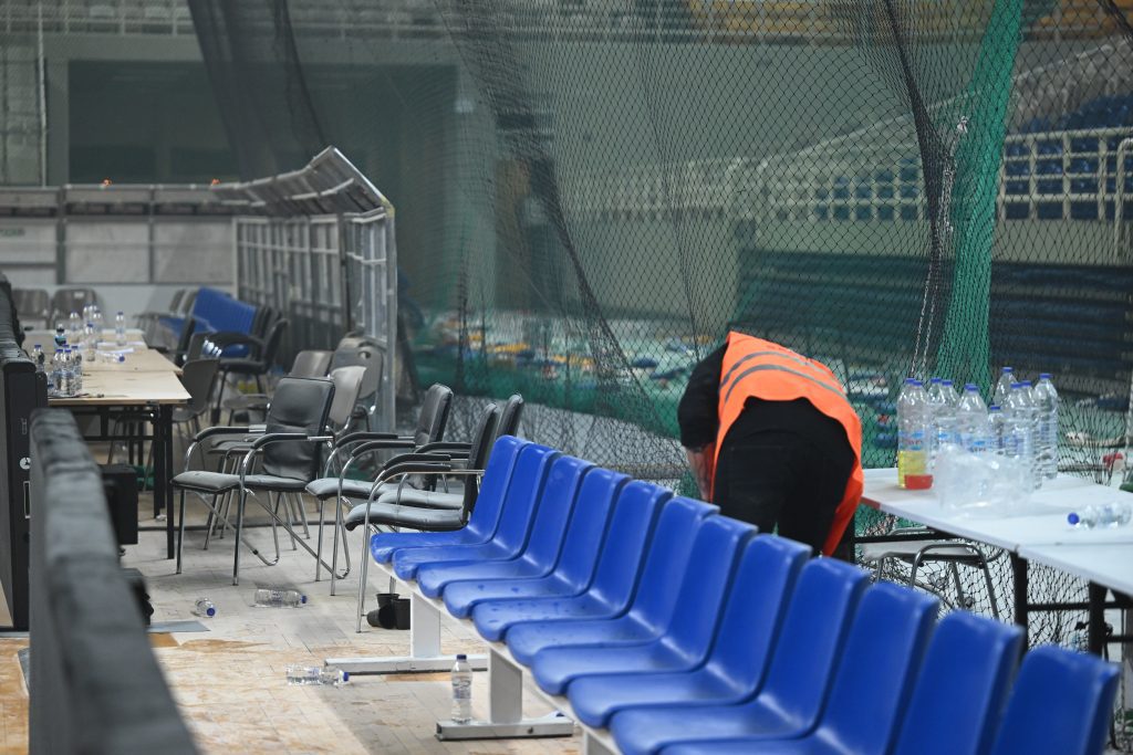 Βομβαρδισμένο τοπίο θυμίζει το ΟΑΚΑ μετά από το ντου των οπαδών του Παναθηναϊκό, 12,5 λεπτά πριν από το τέλος του 4ου τελικού με τον Ολυμπιακό.