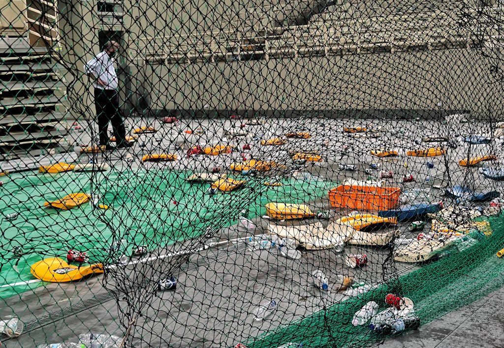 Τα πολεμοφόδια που χρησιμοποίησαν και το “πέσιμο” που έκαναν, έχει αφήσει τα σημάδια του στον αγωνιστικό χώρο του κλειστού, όπως φαίνεται στις φωτό που ακολουθούν.