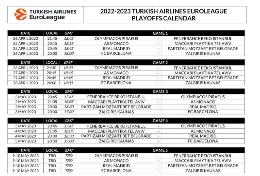 Οι δύο πρώτες αναμετρήσεις του ΣΕΦ διεξάγονται 26/4 (21:45) και 28/4 (21:30). Στην συνέχεια η σειρά μεταφέρεται στην Κωνσταντινούπολη, όπου στις 3/5 (20:45) θα διεξαχθεί το τρίτο παιχνίδι. Αν χρειαστεί και τέταρτο, θα πραγματοποιηθεί και αυτό στην Κωνσταντινούπολη, στις 5/5 (20:45), ενώ σε περίπτωση πέμπτου αγώνα, η σειρά θα επιστρέψει στο ΣΕΦ, με το ματς να διεξάγεται 9 ή 10 Μαϊου.