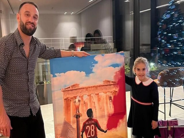 Έτσι, ο Γάλλος έστειλε τις Χριστουγεννιάτικες ευχές του, μέσω twitter, στους followers τους και σε μία από τις φωτογραφίες που πόσταρε, δείχνει τον ίδιο, μαζί με την κόρη του, να κρατάνε έναν πίνακα που απεικονίζει τον Γάλλο με την φανέλα του Θρύλου, να κρατά ένα καπνογόνο (!), με φόντο την Ακρόπολη.