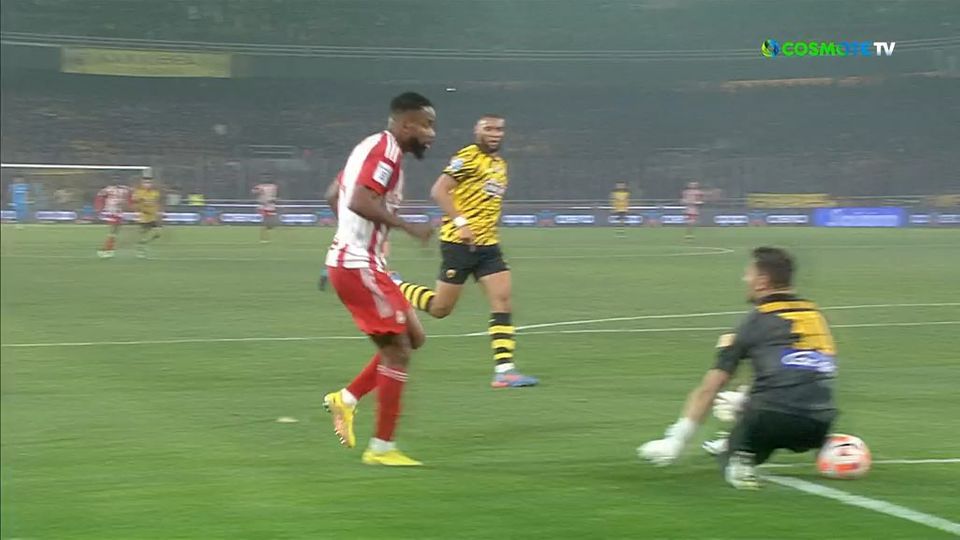 Στο 34’ μεγάλη ευκαιρία για τον Ολυμπιακό με τον Μπακαμπού να κλέβει και να βγαίνει στο τετ α τετ με τον Αθανασιάδη, όμως πλάσαρε πάνω στον τερματοφύλακα της ΑΕΚ.