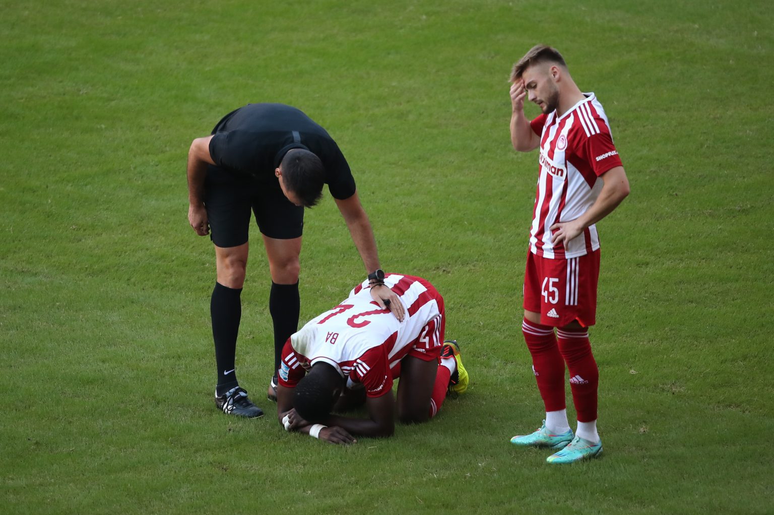 Σύμφωνα με τις πρώτες εκτιμήσεις, ο Μπα έχει υποστεί διάστρεμμα στην ποδοκνημική, ενώ ο Ματιέ Βαλμπουενά έχει υποστεί θλάση στον προσαγωγό δεξιά. Και για τους δύο δείχνει δύσκολο να προλάβουν το ντέρμπι με τον Παναθηναϊκό.