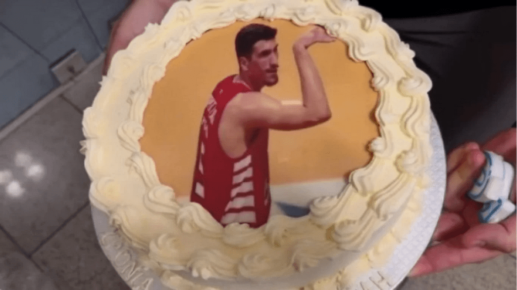 Στην τούρτα είχε μια φωτογραφία του διεθνή Έλληνα γκαρντ του Ολυμπιακού με τον κλασσικό πανηγυρισμό του, με το χτύπημα της κόμπρας.