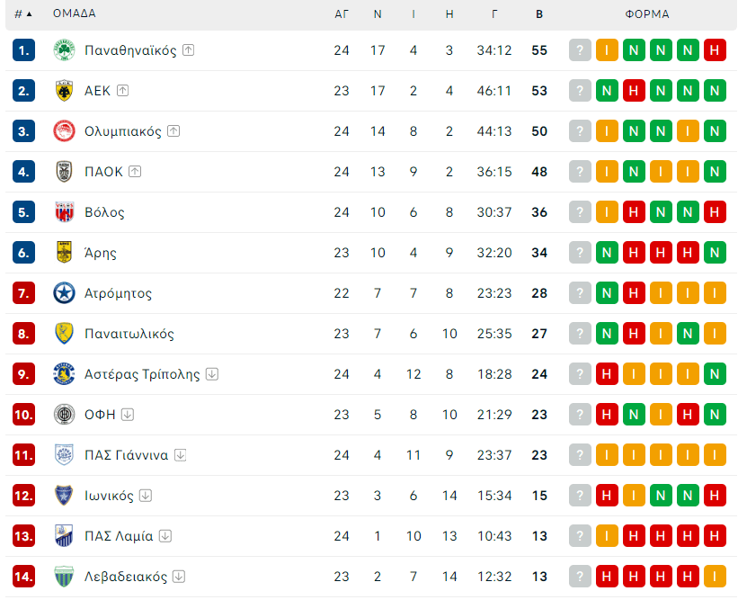 Με την ισοπαλία του Ολυμπιακού με τον Παναθηναϊκό (0-0) παρέμεινε η μεταξύ τους διαφορά στους πέντε βαθμούς, ενώ η ΑΕΚ πλησίασε τους πράσινους στους 2 βαθμούς με τη νίκη της με 2-0 επί του Αστέρα Τρίπολης.